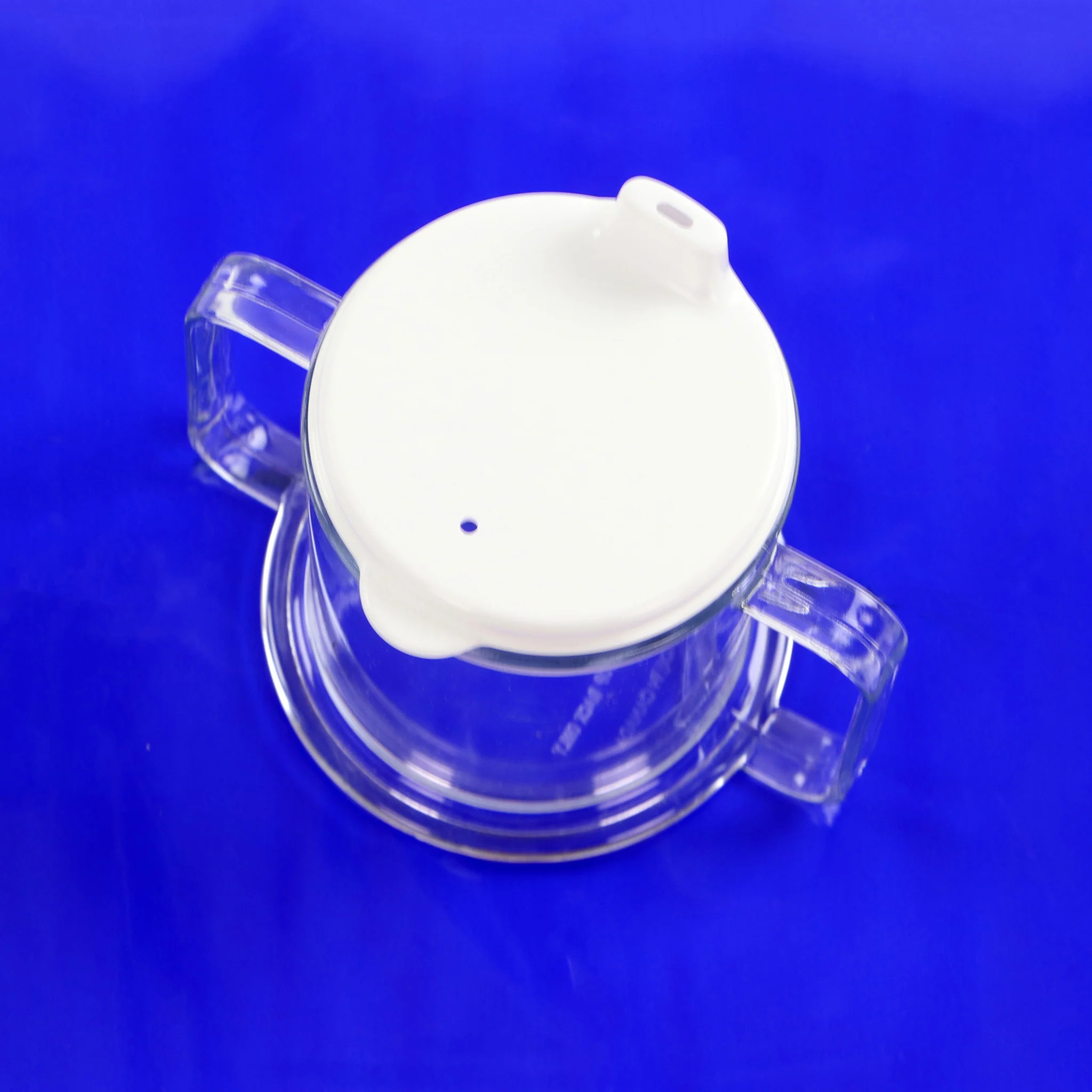 - Le gobelet à double anse, couvercle à débit contrôlé et base antidérapante: il permet de faciliter la prise de boisson, tout en évitant les déversements des liquides. Il a une capacité de 300 ml approximativement.