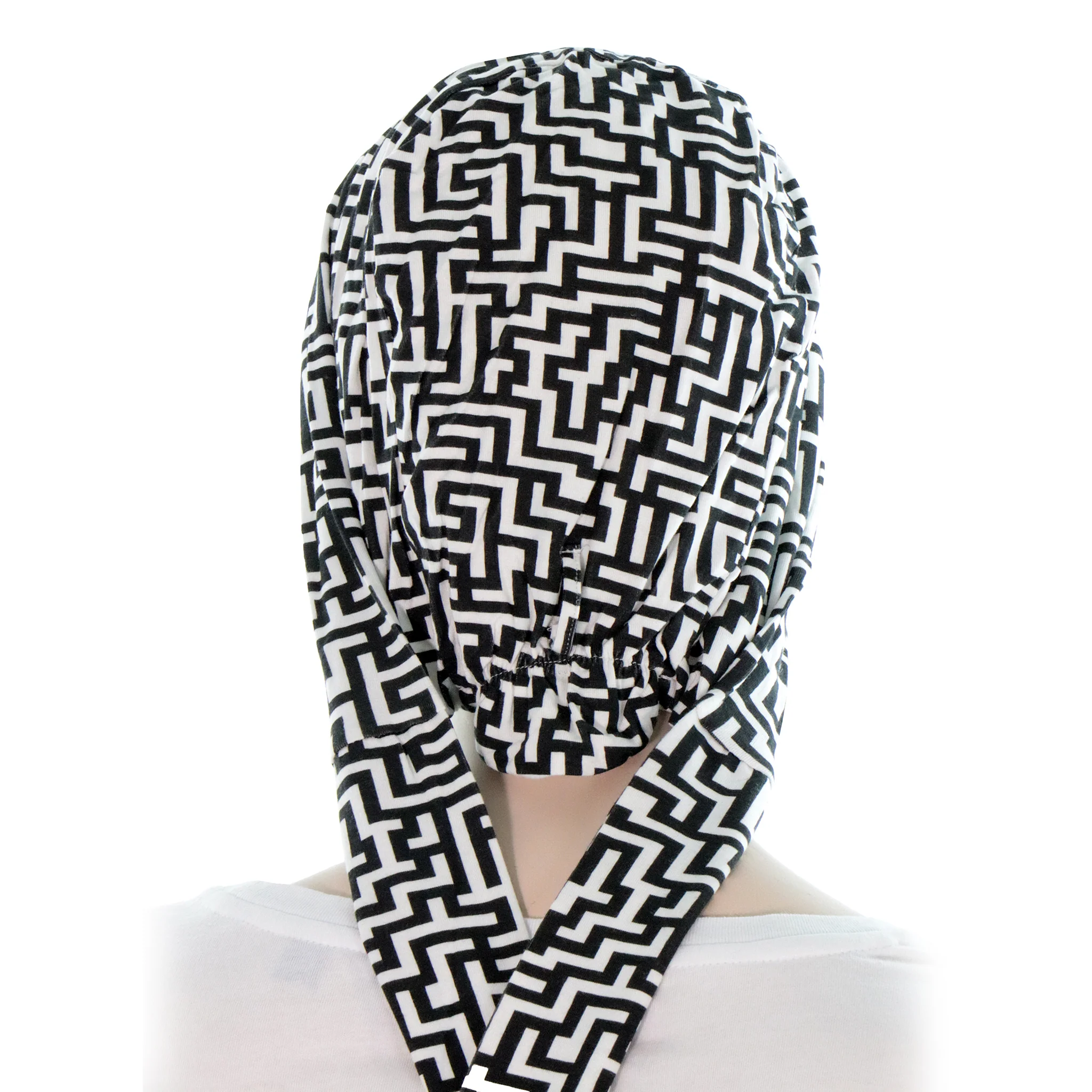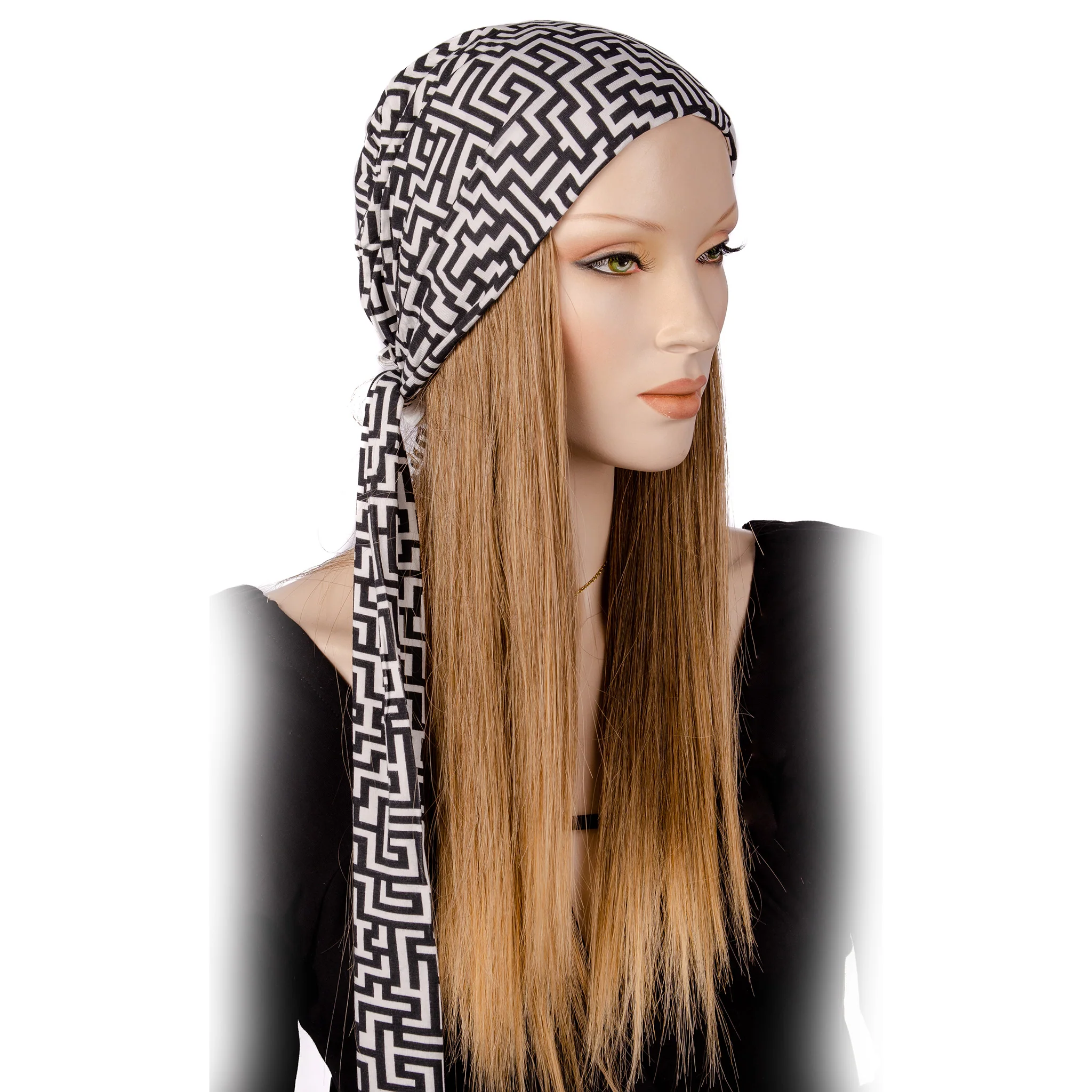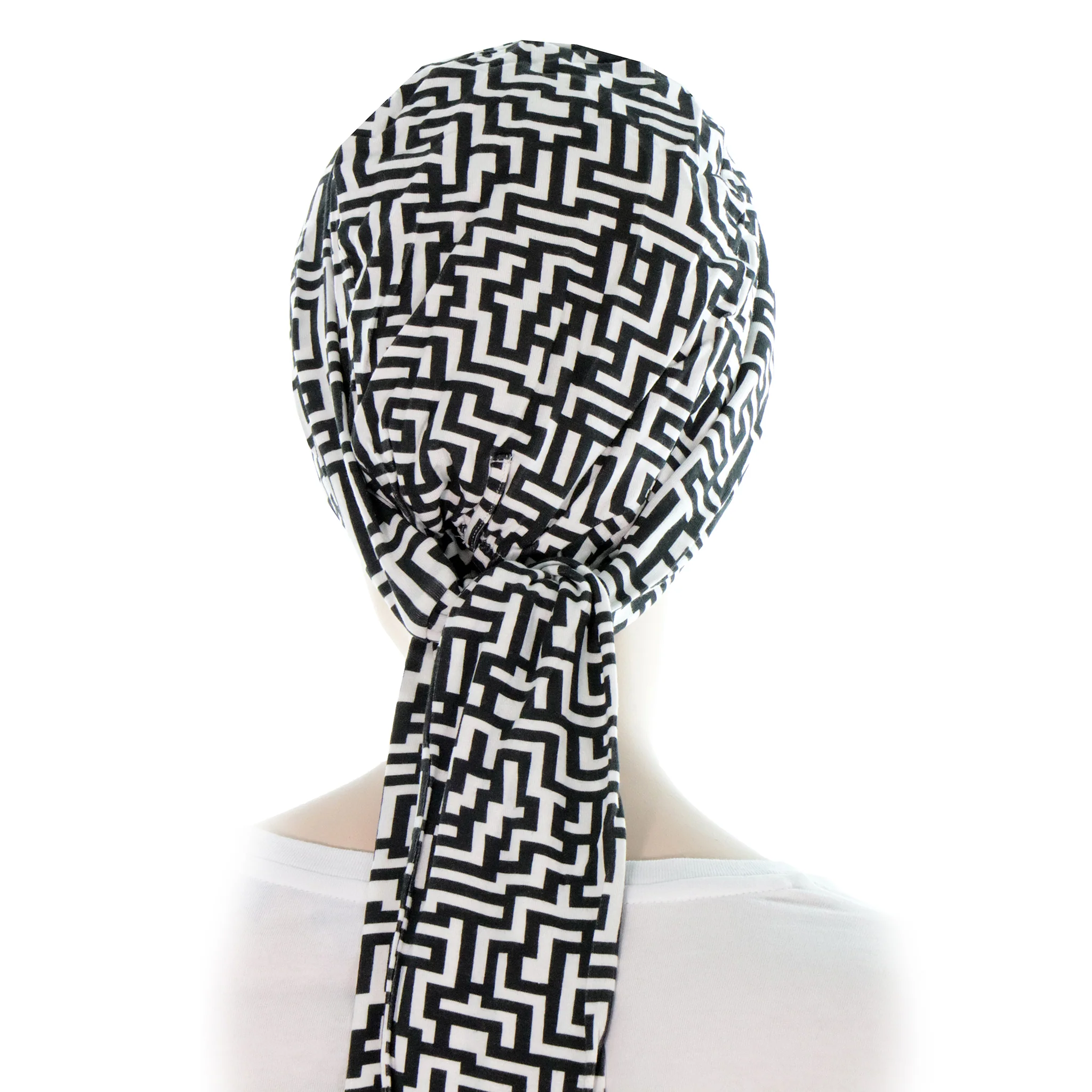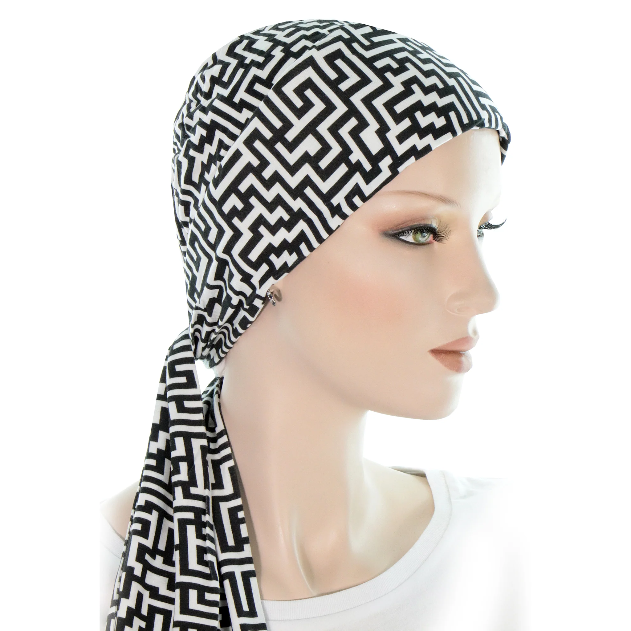 De conception européenne, le foulard pour cancer en bambou biologique est conçu avec des motifs en noir et blanc, modernes et élégants.