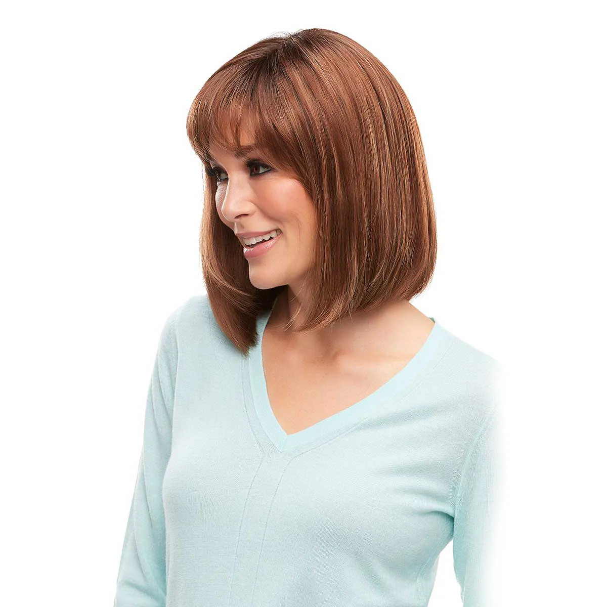 Pour un look plus moderne, cette perruque pour femme à cheveux synthétiques, style Bob long, est conçue avec une frange qui peut être coiffée en plusieurs directions.