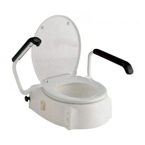 Le siège de toilette surélevé à hauteur réglable est adapté pour une toilette allongée standard. Il a les accoudoirs qui sont rabattables. Ils peuvent être poussés vers l’arrière ensemble, ou un à a fois.