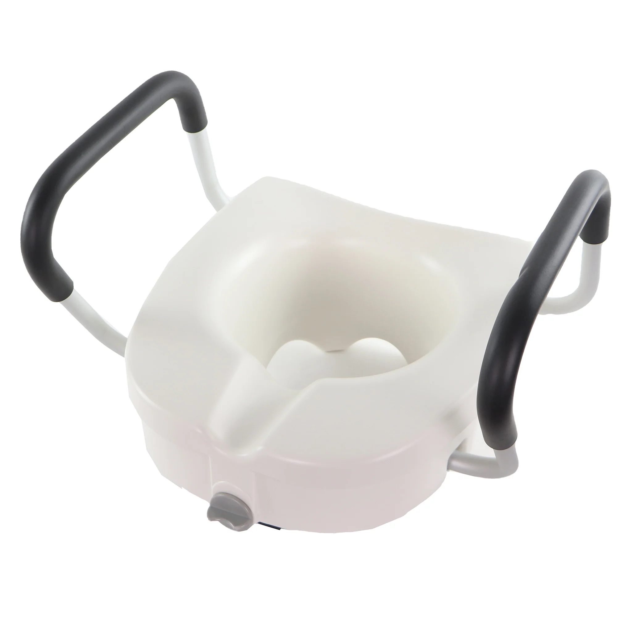 Ce siège de toilette surélevé a des appuis-bras coussinés, qui peuvent être détachés, si désiré. L’assise arrondie avec une hauteur (épaisseur) de 5.5 pouces est faite en plastique moulé très durable.
