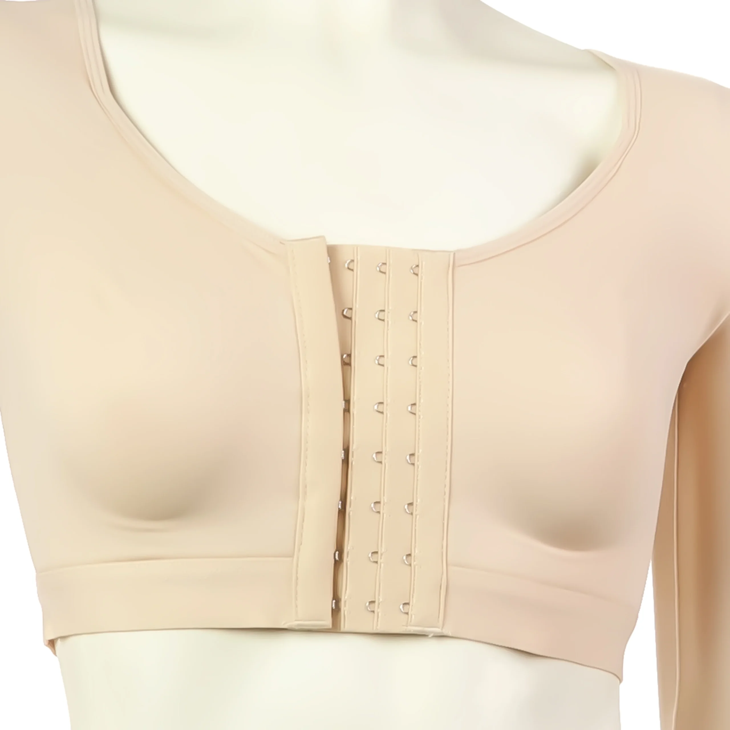 Ce soutien gorge post opératoire sans armature, avec manches, est muni d’une ouverture avec attaches devant à quatre rangées de réglages.