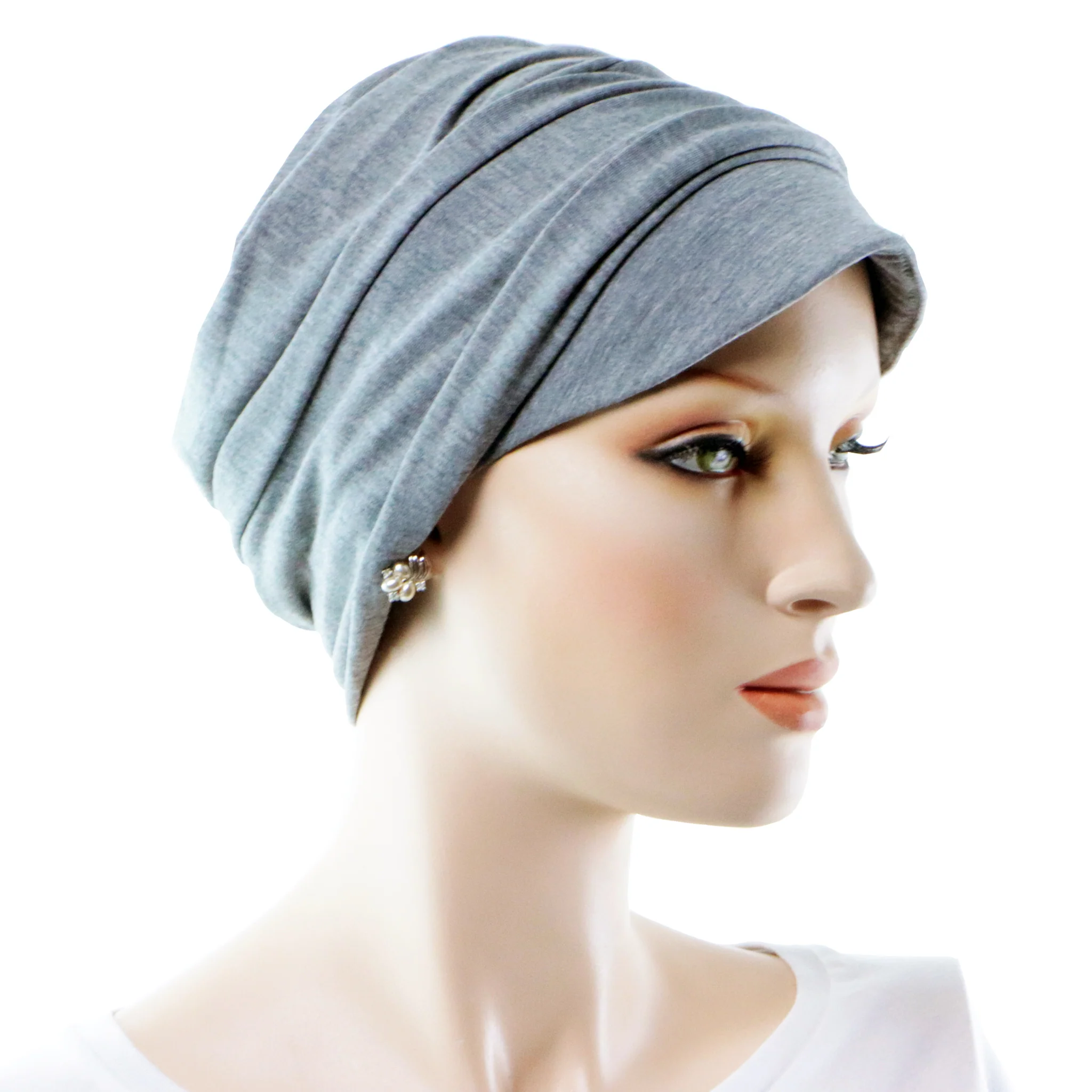 De conception européenne, ce turban chimio en bambou peut être porté aussi comme un chapeau chimio avec rebord en avant, style casquette.