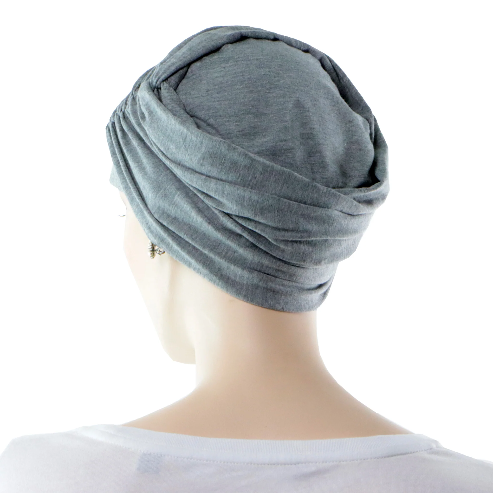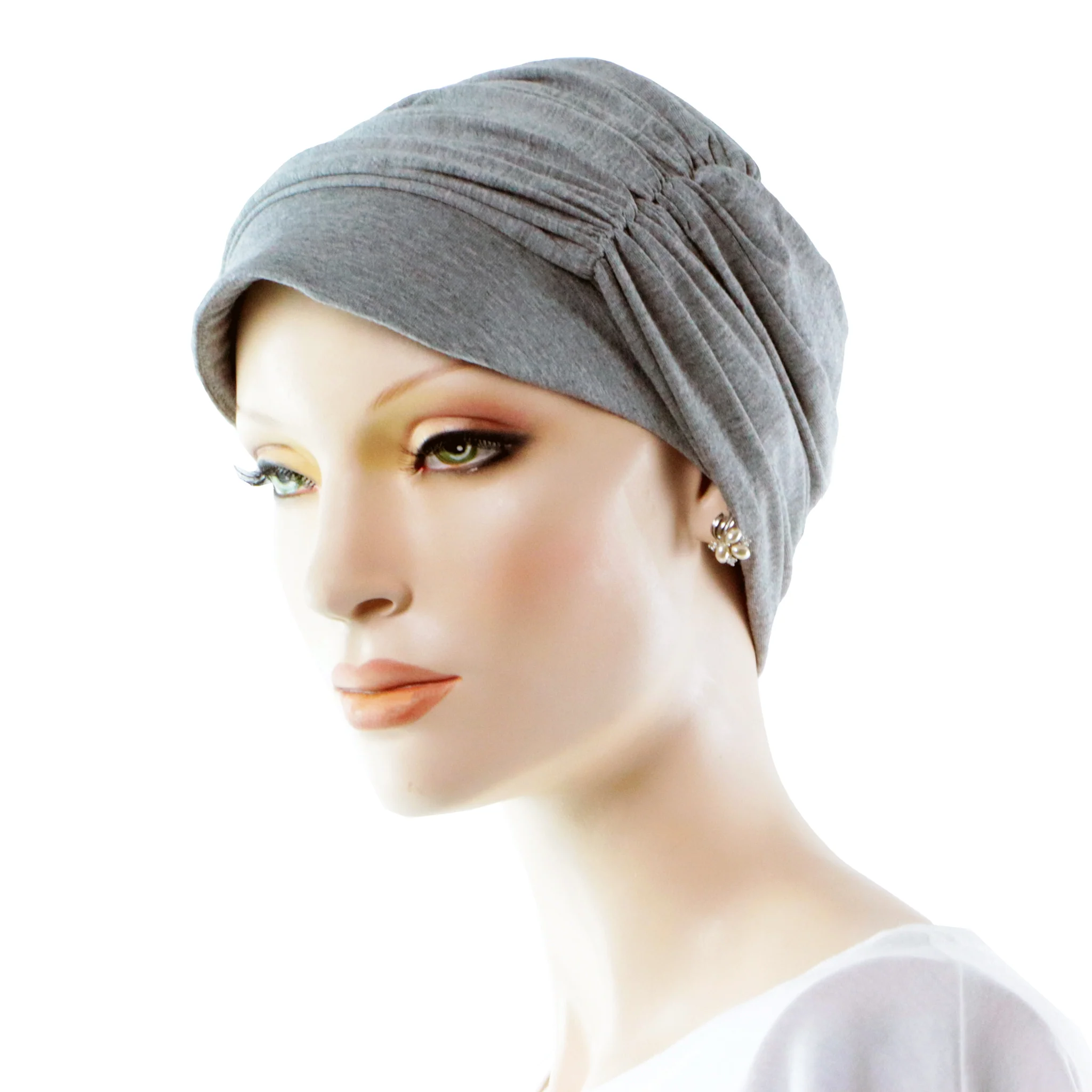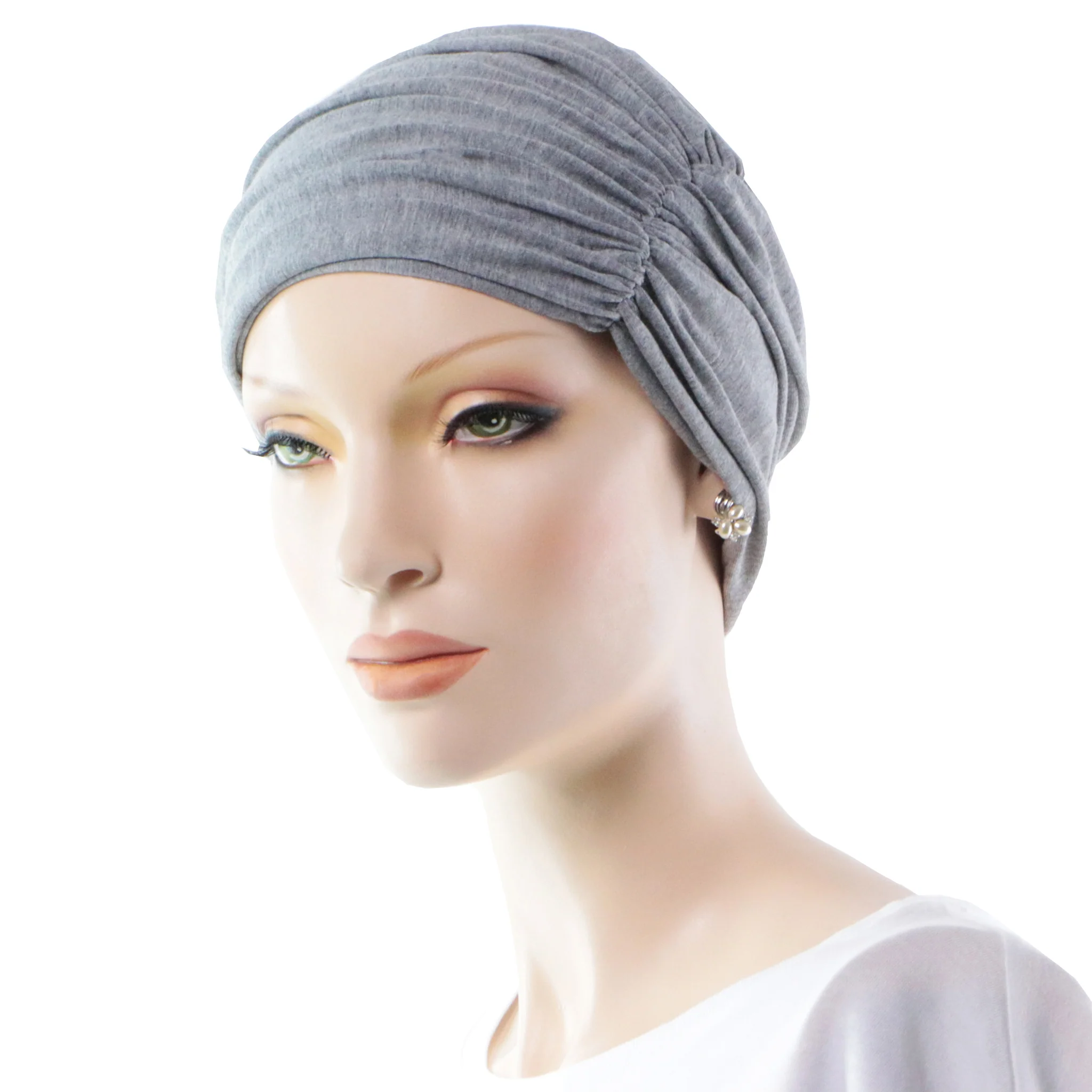L’effet volume généré par le tissu drapé compense en partie pour la perte des cheveux, un effet secondaire courant après une chimiothérapie.